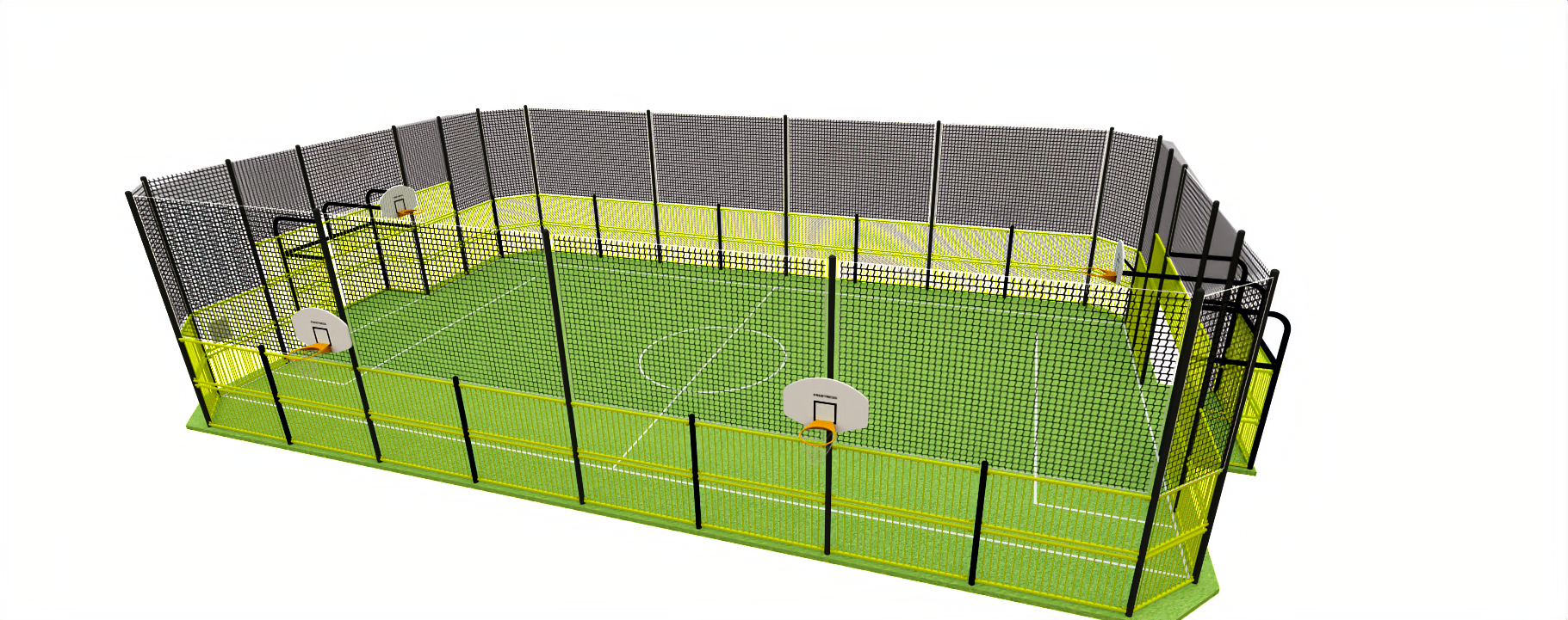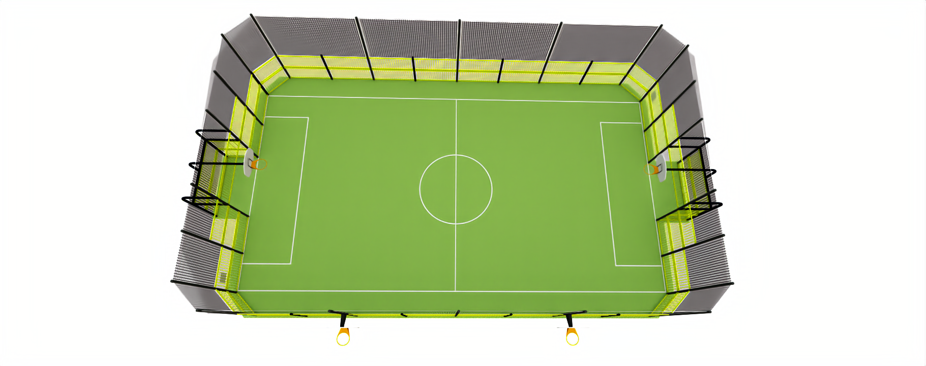 L’équipement est doté de fonds de buts en barreaudage acier, assurant robustesse et durabilité face à une utilisation intensive. La structure intègre une double hauteur de lisse, renforçant la résistance périphérique et contribuant à la stabilité de l’ensemble. Deux buts de basket-ball latéraux à hauteur réglementaire fixe de 3,05 m, équipés de cercles renforcés, permettent une pratique conforme aux standards tout en garantissant une excellente tenue dans le temps.