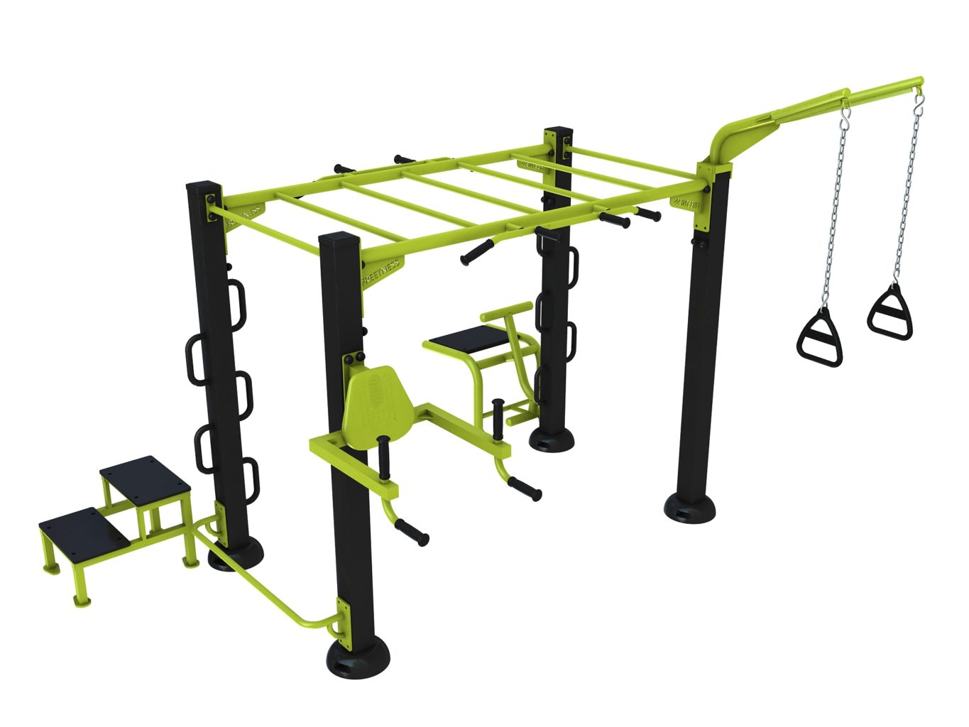 La Cross Rig 1 est un équipement extérieur de cross training. On la retrouve sur les aires sportives de street workout. Grâce à cette station multifaces de cross training, c'est plus de 10 exercices différents de travail au poids de corps qui vous attendent. Anneaux, pont de singe, barre de pompes, chaise romaine, etc (...) y sont combinés pour des séances ultra complètes sur un espace condensé.