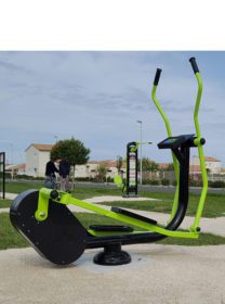 Le vélo elliptique R-Pro Freetness est un appareil de fitness outdoor conçu pour renforcer efficacement les membres inférieurs. Grâce à son mouvement elliptique fluide, il sollicite en douceur les jambes, les fessiers et les mollets, tout en ménageant les articulations. L’agrès est équipé d’un écran LCD couleur, qui permet de régler la difficulté de l’effort en fonction du niveau et des objectifs de l’utilisateur. Idéal pour un usage en libre accès dans les aires de fitness urbaines, parcs ou espaces intergénérationnels.